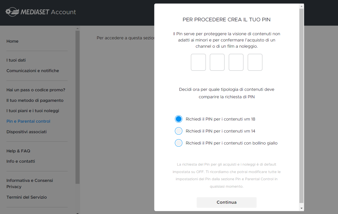 Puoi modificare le impostazioni del PIN o cambiarlo, accedendo sempre alle sezione PIN e Parental control del tuo Mediaset Account.